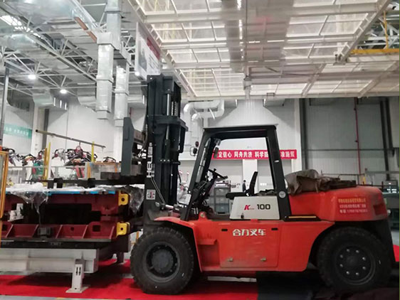 廣汽乘用車宜昌分公司準(zhǔn)備設(shè)備安裝,需要10噸叉車對(duì)液壓機(jī)裝模具,走進(jìn)焊裝車間眼前一亮:一批批紅色的多功能智能機(jī)器人正圍著各自需要焊接的汽車零件揮舞著手臂作焊裝調(diào)試;有的一個(gè)組件有四、五機(jī)器人在焊裝,有的有七、八個(gè)機(jī)器人,也有的有十多個(gè)—-分成多個(gè)單元來完成組裝任務(wù),很少看到人在操作,機(jī)器代替人是場(chǎng)全新的革命,此時(shí)是最好的見證。今天也有幸在這個(gè)車間給液壓沖壓設(shè)備安裝模具,這些設(shè)備將機(jī)器人焊接的小零件沖壓成型汽車的前蓋、后蓋———一共有六個(gè)液壓沖壓設(shè)備;也有六套模具,最重的有9.8噸,最輕的也有8噸重,我的任務(wù)是先用10噸叉車將模具架叉到?jīng)_壓設(shè)備安裝模具架的位置由專業(yè)安裝人員安裝,模具架上面有二條凸起的軌道;然后用叉車分別將9噸左右的模具叉到模具架上,(叉路在模具上面)用模具下面的卡槽對(duì)準(zhǔn)模具架上的軌道,一開始要對(duì)準(zhǔn)很難的,因?yàn)槟憧床坏较旅娴能壍溃瑖L試了多次終于對(duì)上,再將模具推到設(shè)備里面。說實(shí)話有點(diǎn)難,但做事沒有任何理由不做好,慢慢地后面的幾套模具也得心應(yīng)手。